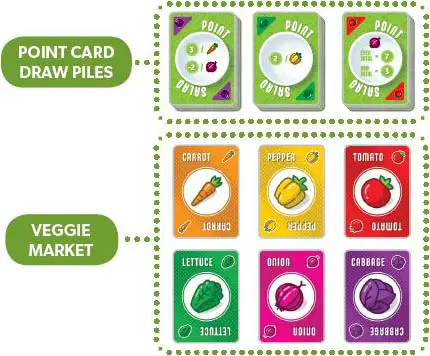 Flip the cards over from the point side to the veggie side as they enter the market. If one of the draw piles of point cards runs out, split the largest pile roughly in half, and move the bottom half to replace the empty pile (ensuring the point card on top of the largest pile does not move).