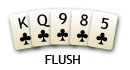 ![]() | FlushA flush is a hand where all of the cards are the same suit, such as J-8-5-3-2, all of spades. When flushes ties, follow the rules for High Card. |