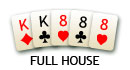![]() | Full houseA full house is a three of a kind and a pair. Ties are broken first by the three of a kind, then pair. So K-K-K-2-2 beats Q-Q-Q-A-A, which beats Q-Q-Q-J-J. |