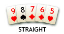 ![]() | StraightA straight is 5 cards in order, such as 4-5-6-7-8. An ace may either be high (A-K-Q-J-T) or low (5-4-3-2-1), but the straight may not 'wraparound'. When straights tie, the highest straight wins. If two straights have the same value (AKQJT vs AKQJT) they split the pot. |