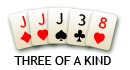 ![]() | Three of a kindThree cards of any rank, matched with two cards that are not a pair. Again, highest three of a kind wins.. If both are the same rank, then the compare High Cards. |