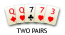 ![]() | Two pairsThis is two distinct pairs of card. The highest pair wins ties. If both hands have the same high pair, the second pair wins. If both hands have the same pairs, the high card wins. |