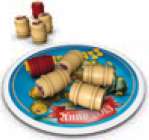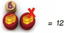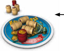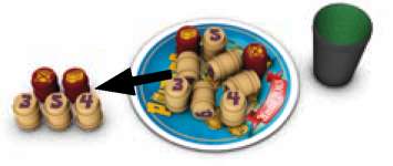 If the innkeeper continues rolling, he has to leave the three standing number barrels alone, but he may freely choose whether he wants to leave one or both special barrels standing or include one or both special barrels in his new roll.