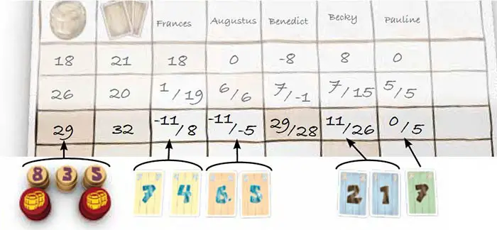 Now players settle the bill! All guests make their orders known. To this end, they reveal the cards they have laid out. If the innkeeper has failed, players score as follows: