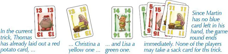 If a player can no longer play a suitable potato card, he shows his hand cards and the round ends immediately. No sack card is given for this incomplete trick. All cards of this trick are put on the discard pile.