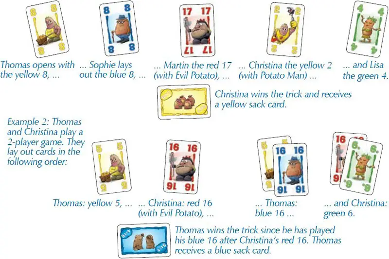 2 players: In the 2-player game, a trick consists of 4 potato cards (and 4 colors); both players alternate, playing one card each (see example 2). After each card played, the player draws another card from his draw pile.
