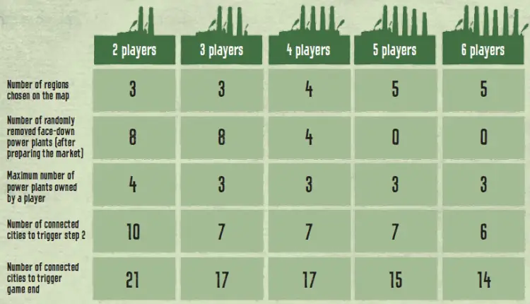 Depending on the number of players some details of the game change. A summary is shown in the following table. For example you need fewer power plants for 2 players, but both of them can own up to 4 power plants.
