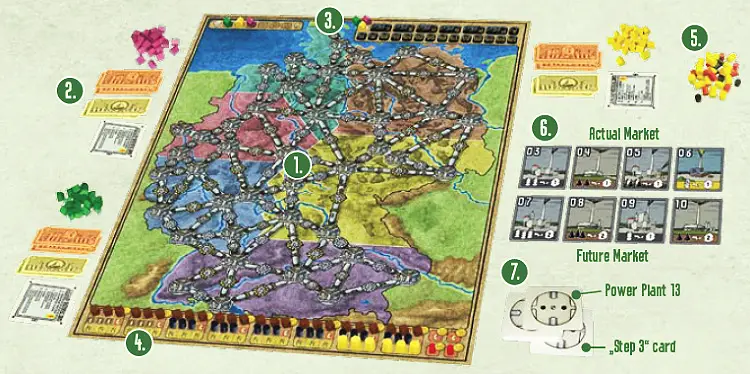 Place the remaining resources as a supply near the board. Take the power plant cards numbered 03 to 10 and place them near the board in two horizontal rows. These power plants are an array of 2 x 4 cards (the power plant market). In the upper row, place power plants numbered 03 to 06 in ascending order, left to right, beginning with the least expensive; this is the actual market.
