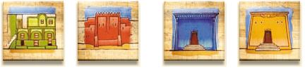 Each player uses his pyramid tiles and pyramid chamber tiles to build a step pyramid. Each subsequent layer of the step pyramid contains one tile fewer than the layer below. The player may rearrange the tiles in his pyramid at any time as he wishes, but he may only build one pyramid during the game.