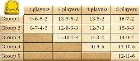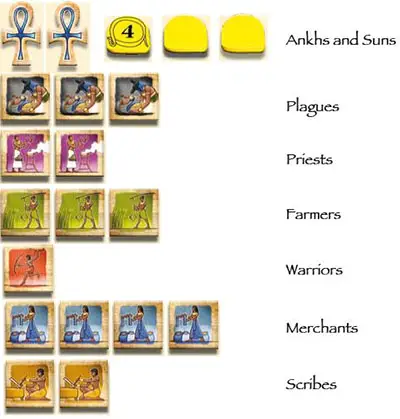 Also place the ankhs beside the game board. Separate the suns into groups as shown in the table: