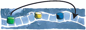 New amoebas must be placed in a space that contains no amoeba of the same color but that borders (horizontally or vertically but not diagonally) a space which already contains an amoeba of the same color. This amoeba may be one that has just been placed on the board.