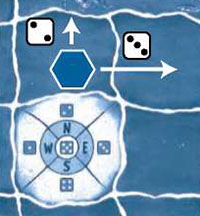 The amoeba then moves one space in the direction shown by that die roll; (l=West, 2=North, etc). A roll of 5 means that the amoeba remains in place; a 6 gives the player a free choice of direction.