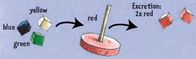 Once the amoeba has moved or drifted, it attempts to feed. An amoeba eats three Foodstuff cubes per turn, but never one of its own color. In a four player game it eats one cube of each of the other three colors.