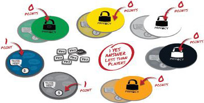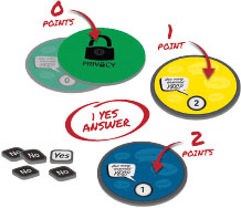 Example: There is exactly one "Yes" answer. First the question if anyone guessed one is asked. The blue player set his voting dial to 1 and he advances two spaces on the game board.