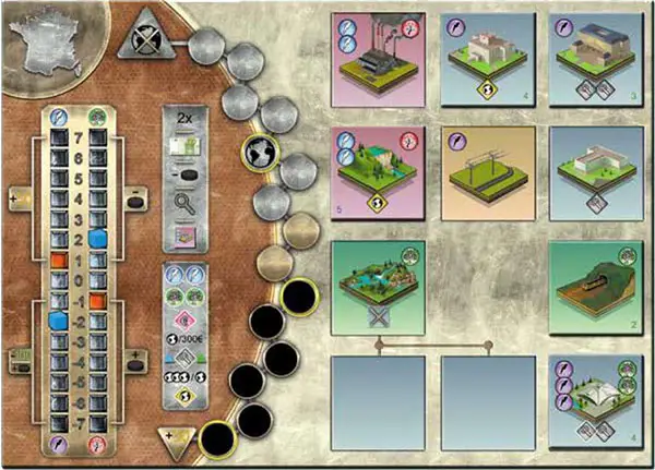 Energy: if their energy total is positive, the player gets 50€ for each positive level. If their total is negative, the player must pay 100€ or add a disc to their Pollution track for each negative level.