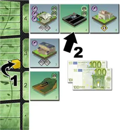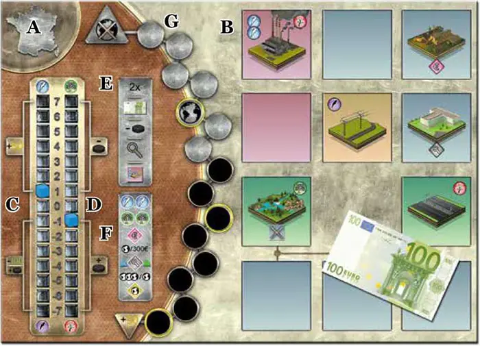 Ecology: if their ecological total is positive, the player removes one disc from their Pollution track for each positive level. If there are no more discs left on their track, they gain 50€ for each disc they still needed to remove. If their total is negative, the player adds a disc to their Pollution track for each negative level.