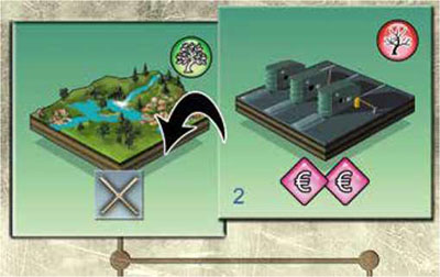 Example: a player covers their Coal-Fired Power Station with an Oil Fired Power Station. That player increases their energy total by 2 (the Oil station produces 4 energy instead of 2), and reduces their ecology total by 1 (as the Oil station increases pollution by 2 instead of 1).