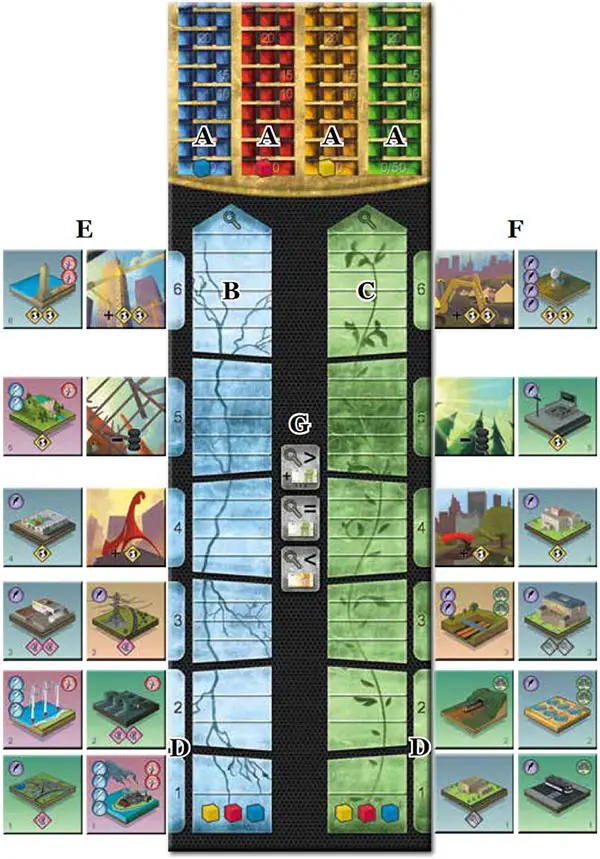 After having placed their tile, the player adjusts the energy and ecology totals of their individual board according to the symbols of the new tile (and possibly of those of the covered tile, the effects of which are canceled).