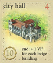Example: at game end, the owner of the occupied city hall also has: hacienda, harbor, office, construction hut, large warehouse, and residence: he earns an additional 7 VP.