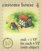 The owner of the occupied customs house earns, at game end, one additional victory point for every four victory points he acquired during the game. The player should count only his victory point chips (and any extra victory points recorded on paper after the chip supply was exhausted, but before game end).