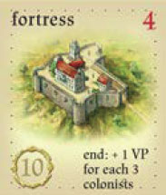 Example: at game end, the owner of the occupied fortress has a total of 20 colonists on his plantations, quarries, buildings, and in San Juan: he earns an additional 6 VP.
