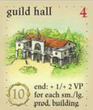 The owner of the occupied guild hall earns, at game end, an additional 1 VP for each small production building (occupied or unoccupied) in his city (=small indigo plant and small sugar mill), and an additional 2 VP for each large production building (occupied or unoccupied) in his city (= indigo plant, sugar mill, tobacco storage, and coffee roaster).
