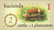 On his turn in the settler phase, the owner of an occupied hacienda may, before he takes a face-up plantation tile, take an additional tile from the face-down stack (the top-most) and place it on an empty space on his island. He may then take his normal turn in the phase.