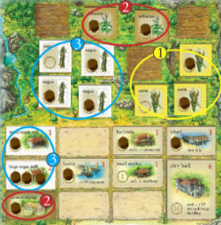 Example: at game end, the owner of the occupied guild hall also has a small and large sugar mill, a small indigo plant, and a coffee roaster in his city: he earns an additional 6 VP.