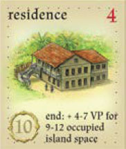 Example: at game end, the owner of the occupied residence has filled 10 of his 12 island spaces with plantations and quarries: he earns an additional 5 VP.