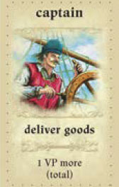 The captain is in charge of shipping goods to the old world. This means that the captain is the first to load goods on the cargo ships. Then, the other players follow, in clockwise order from the captain.