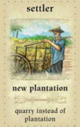 Finally, the settler player puts the untaken plantation tiles face-up on a plantation discard stack and draws new plantation cards from the facedown stacks, placing them face-up next to the quarry stack. He draws one more than the number of players.