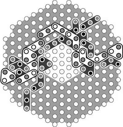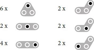 The players each have a set of 18 pieces: 6 straight pieces, 6 angular pieces and 6 triangular pieces. Each piece has 3 dots, one of which is colored.