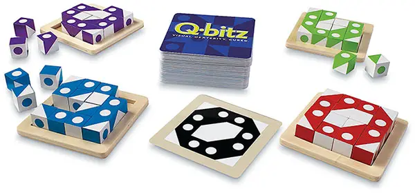 Any player turns over the top Q-bitz card. Players race to recreate the pattern shown on the card using their set of cubes, rotating the cubes in anyway.