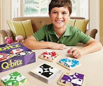 Any player turns over the top Q-bitz card. Players have io seconds to memorize the card. The card is then turned facedown and players must try to arrange the cubes in their tray to match the card from memory.