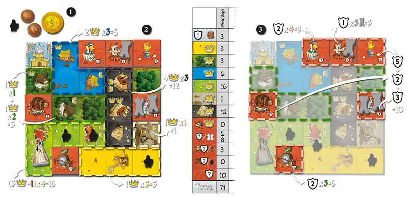 Grasslands (light green) score 16 points: 4 squares x3 crowns and the Queen . This Kingdom had the most towers, so the player hosted the Queen and placed it on the largest territory to count as an extra crown.
