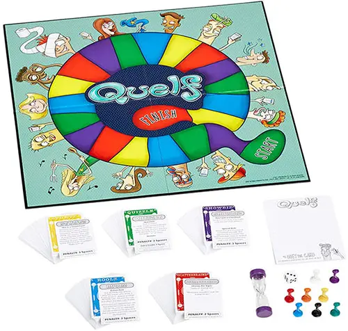 Each player chooses a game piece representing a character in Quelf and places it on the starting space..