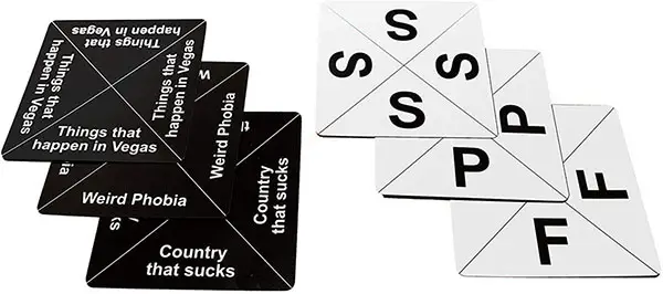 Flip a black category card and read it aloud, then immediately flip over a white letter card.