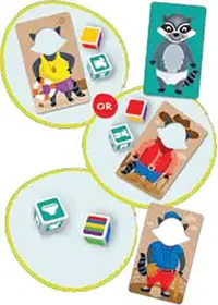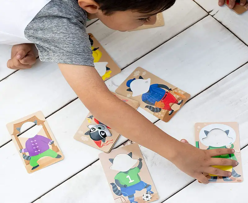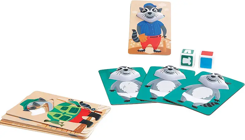 Play continues until all the costume cards have been correctly matched and placed on a raccoon player card.