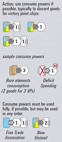Consumption is mandatory. However, consume powers can be invoked in any desired order, even if this results in some unconsumed goods left over that could have been consumed with a different order (due to their kinds not matching the player's remaining unused consume powers). Each consume power can be used only once in a consume phase. Some powers allow multiple goods, "up to" some number, to be discarded, with each good producing an effect. Such powers must be fully used, if possible, when invoked.