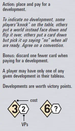 Action: each player places a development card from his hand face down, or no card if a player doesn't intend to place a development. Once all players have done so, they simultaneously turn them face up and then pay for them. If desired, players can put their intended developments (if any) under their action card, revealing them when everyone is ready.