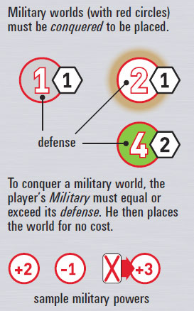 Military Conquest: some worlds have red circles and, within them, a red outlined number, ranging from 1-7; this is the world's defense. These worlds cannot be placed by payment, but instead must be conquered. To conquer a world, a player's total Military must equal or exceed the world's defense. Then, the player simply places it - and its windfall good, if it has a halo - without paying for it (and then draws a bonus card if that player chose Settle).