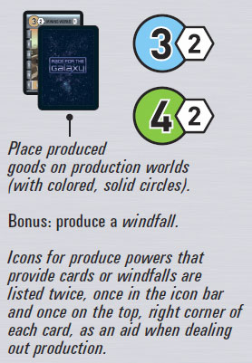 Players who chose Produce, as the bonus, produce a good (if possible) on one of their windfall worlds that does not already have a good.