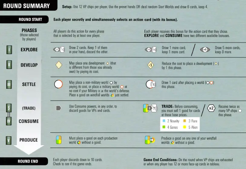 Once all players have done so, they turn these action cards face up. Then, the players perform the selected phases in order (I: Explore; II: Develop; III: Settle; IV: Consume; V: Produce), omitting every phase not chosen by at least one player.