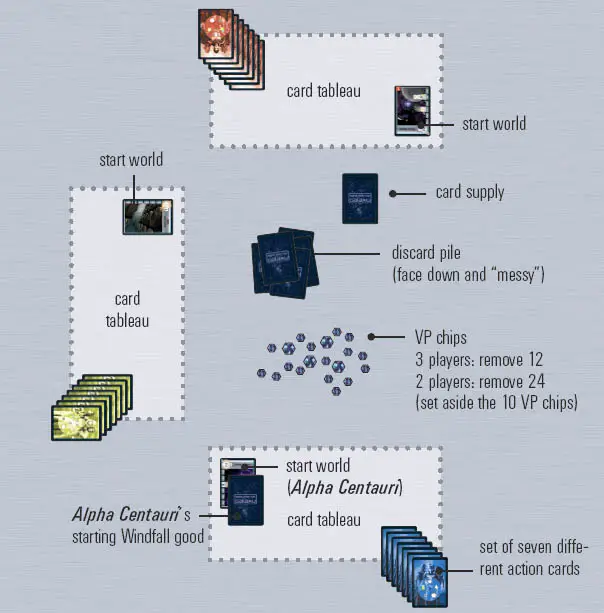 Find and shuffle the five start worlds. Deal one world face up to each player. These form each player's initial card tableau.