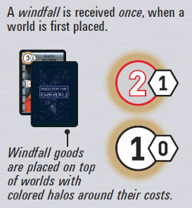 Some cards, such as Genetics Lab, can also produce goods on windfall worlds (without goods). Others, such as the Pan-Galactic League, provide a card draw for each world of a specific kind in a player's tableau (such as Genes worlds, with either a green halo or a green solid circle).