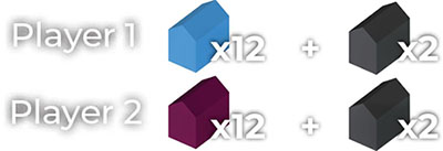 When setting up, give one player 12 Purple houses, and the other player 12 Blue houses. Then, each player takes 2 Black houses - their Powerhouses.