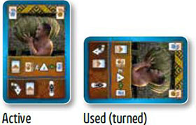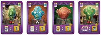 Masks: The player places his or her chosen Mask Card in front of his or her screen. Masks may provide treasure (Pearls or Mana) or allow a player to advance his or her Tattoo Marker.