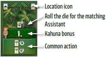 Each location has an action that can be taken by all players, as well as granting a bonus for the player who claimed that location. That player is called the Kahuna; Kahuna bonuses are indicated by