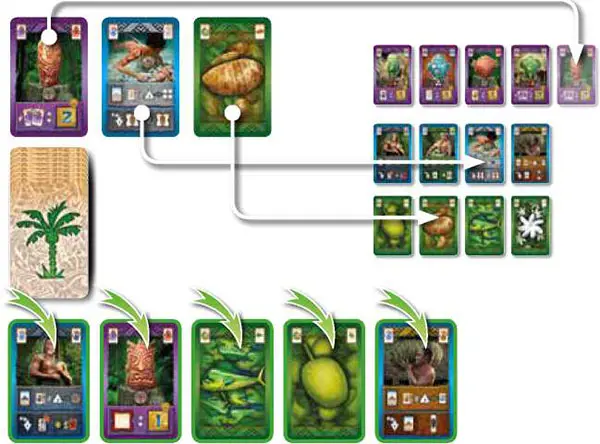 Starting with the Kahuna and going in clockwise order, each player chooses one of the Forest Cards on display. When only one Card remains, add it to the appropriate Market.