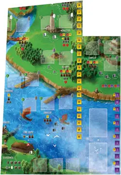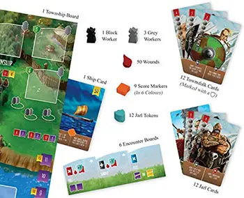 Each player receives 1 Encounter Board. This will be used to keep track of any Jarl encounters during the game. Shuffle all new Townsfolk Cards together with all cards from the base game of Raiders.